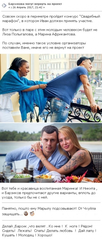 28 апреля 2017 года Елизавета Полыгалова буквально вышла из себя, услышав о том, на каких условиях Ивану Барзикову было предложено снова стать участником реалити-шоу. Едва ли Иван, оставивший телестройку ради того чтобы возобновить отношения с Елизаветой, ожидал того, что коллеги по периметру немедленно отправят его за пределы проекта, причем теперь навсегда. Правда, сам Барзиков старается не выдавать своих переживаний, но фанаты нисколько не сомневаются в том, что он весьма огорчен таким поворотом событий и охотно вернулся бы на телепрограмму. При этом молодому мужчине уже представилась желанная возможность, но это едва ли придется по душе его подруге. Исходя из последних новостей с Поляны, ведущие официально предложили Ивану снова участвовать в телешоу и попробовать свои таланты в начинающемся конкурсе «Свадебный марафон», однако его парой в таком случае должна стать не Полыгалова, а Марина Африкантова. Пока неизвестно, как отреагировал на это предложение Иван, попросил ли он разрешения поразмышлять или сразу же дал окончательный ответ. Но в настоящее время Барзиков явно наслаждается компанией Елизаветы и не перестает публиковать их общие фотографии. Свое мнение о том, согласится ли Иван Барзиков на предложенный ведущими телестройки вариант, вы можете изложить в комментариях.
