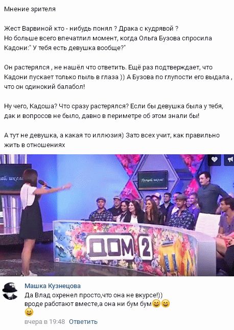 24 июня 2017 года телеведущая Ольга Бузова легкомысленно проболталась в эфире о тайне, скрываемой ее коллегой Владом Кадони. Еще в период своего участия в телестройке Ольге ничего не стоило произнести вслух явную глупость, о которой девушке потом долго напоминали с ехидной насмешкой. Эта ситуация почти не изменилась и с того времени, когда Бузова заняла пост ведущей реалити-шоу. В ходе очередного проводимого в городских квартирах ток-шоу Ольга снова выпалила неподходящую фразу без всяких предварительных размышлений. Бузова поинтересовалась у Кадони, имеется ли у него подруга. Многие полагают, что таким образом она неумно выдала секрет Кадони, поскольку в случае наличия у него долговременных и прочных отношений коллегам неминуемо было бы об этом известно. Более того, фанаты телепроекта полагают, что разговоры Влада о том, что он якобы состоит в гражданском браке с представительницей прекрасного пола, лишь прикрывают его нетрадиционную сексуальную ориентацию. Свое мнение о том, действительно ли Ольга Бузова своим некорректным вопросом поставила Влада Кадони в весьма неловкое и неприятное положение, вы можете высказать в комментариях.