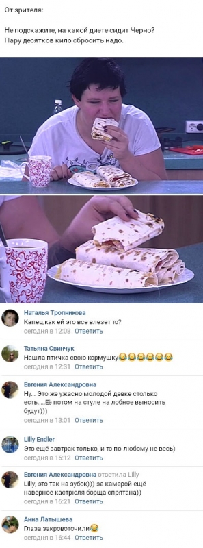 24 июля 2017 года у фанатов реалити-шоу вызвало искреннее возмущение питание Александры Черно, ведь девушка постоянно твердит о своем намерении снизить вес и откорректировать фигуру.