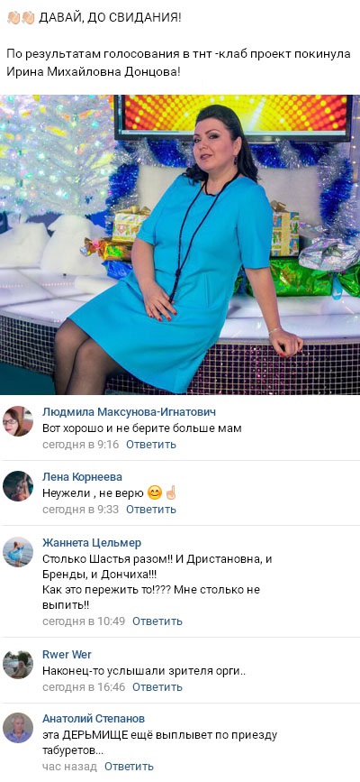 24 июля 2017 года выяснились результаты голосования, проведенного в ТНТ-клаб, в связи с которыми за пределы периметра будет вынуждена отправиться участница телестройки, являющаяся наиболее авторитетной среди коллег по телешоу. Едва фанаты телепроекта успели проститься с Мариной Тристановной Абрамсон, как в Интернете было размещено известие о том, что пара Дмитрия Дмитренко и Ольги Рапунцель также оставляет телепрограмму. Теперь оказалось, что вслед за этими ребятами изгнанию подверглась также Донцова-старшая. Во всяком случае, именно Ирина Михайловна Донцова получила максимальное количество голосов в ТНТ-клаб, что обрекает ее на расставание со статусом участницы. Однако отнюдь не все верят в то, что мать Майи Донцовой на самом деле уйдет с проекта. Многие полагают, что организаторы непременно сумеют оставить ее в периметре либо снова вернут на телестройку после отпуска на непродолжительный период времени. Свое мнение о том, действительно ли Ирина Михайловна Донцова все же сможет остаться участницей реалити-шоу, невзирая на итоги голосования, вы можете изложить в комментариях.