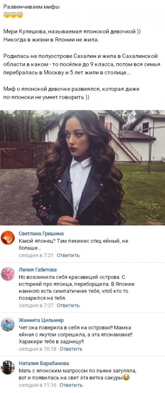 23 июля 2017 года появившийся компромат по поводу Мэри Кулешовой, которая чрезмерно увлеклась сочинением не соответствующих действительности историй о себе, наконец расставил многое по своим местам. Фанаты телестройки еще не забыли громких заявлений этой девушки по поводу ее происхождения из благородной семьи и корнях, имеющих отношение к японскому народу. В настоящее время яркая и эффектная девушка, внешность которой на самом деле не слишком типична для России, считает себя значительно выше окружающих и никогда не забывает подчеркнуть свою позицию. Однако теперь, когда вся правда об ее происхождении стала известной общественности, Мэри едва ли сможет и далее обманывать людей. Исходя из компромата, размещенного в Интернете, Кулешова появилась на свет отнюдь не в Москве, а в маленьком селении, расположенном на Сахалине. В столицу Мэри переехала вместе с родителями буквально несколько лет назад. При этом отец Кулешовой вовсе не является японцем. Соответственно, нет ничего удивительного и в том, что девушка не владеет «языком предков». Свое мнение о новой информации относительно Мэри Кулешовой вы можете высказать в комментариях.