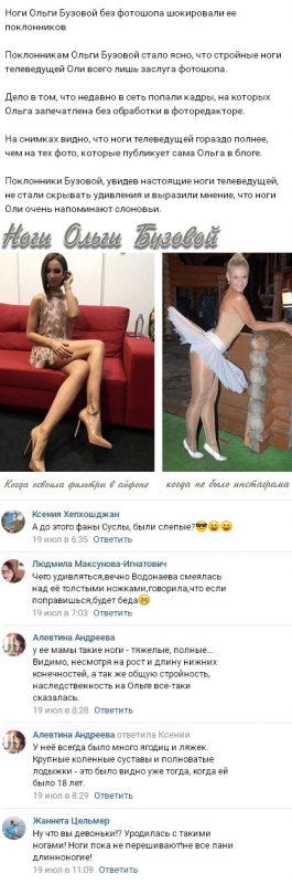 Теперь у посетителей социальных сетей появились все возможности для того, чтобы убедиться в том, насколько стройные и длинные ноги телеведущей в действительности являются лишь продуктом работы Фотошопа. Во всяком случае, на фотографиях, сделанных около 7-8 лет назад, Бузова предстает девушкой с достаточно короткими ногами и довольно толстой задней частью тела. При этом ноги Ольги, пусть и за весьма продолжительное время, едва ли могли увеличиться в длину.