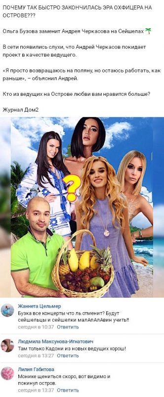 Уже в течение нескольких дней в Интернете распространяются сплетни относительно того, что руководство телепроекта намеревается снова вернуть в столицу Андрея Черкасова. Однако если первоначально должность Черкасова планировали передать Екатерине Жуже, то теперь выступить в роли замены Андрея придется именно Бузовой. К тому же из-за этой незапланированной командировки Ольга, по крайней мере, на протяжении двух недель не сможет заниматься пением. Во всяком случае, молодой женщине не удастся выступать с композициями перед публикой и записывать новые хиты.