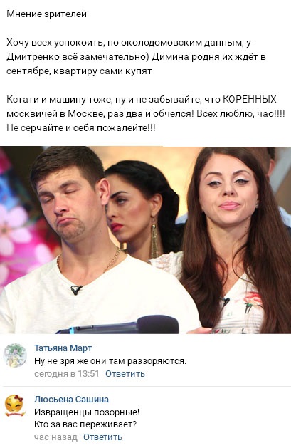 Но, исходя из утверждений соседки семьи Рапунцель во Владивостоке, все проблемы Ольги с родственниками ее мужа являются исключительно пиар-ходом для эфиров. по словам этой женщины, в действительности Рапунцель вполне дружески общается и с матерью Дмитрия, и с другими близкими для ее супруга людьми. К тому же семья Дмитренко уже в сентябре ожидает недавно заключившую брак пару в гости, и все родственники от души радуются тому, что Ольга и Дмитрий планируют приобрести собственную жилплощадь и автомобиль, а также обзавестись детьми.