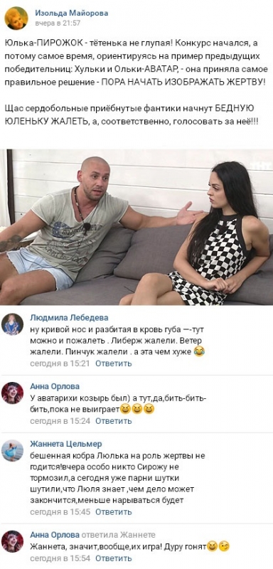 Видимо, именно из этих соображений Юлия не пожелала упускать столь выгодной возможности и решила превратить себя в жертву, прибегнув ради этой цели к помощи Сергея, желая получить максимальную поддержку поклонников телестройки и, соответственно, как можно больше голосов за свою кандидатуру.