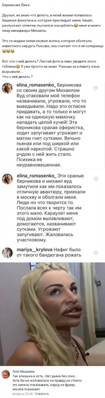Совсем недавно выяснилось, что Леонид Плащинский напал на Викторию, используя при этом оружие. Сама Берникова уже дала подтверждение этому факту. Но значительно более, чем поступки ее экс-супруга, Викторию тревожит преследование со стороны некоей неадекватной дамы. Как утверждает экс-участница телепроекта, Элина Ромасенко буквально не оставляет ее в покое, осыпает оскорблениями, не устает писать о Вике весьма нелицеприятные вещи и даже не стесняется угрожать, причем не только Берниковой, но и пиар-менеджеру молодой женщины.