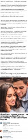 Свое мнение о том, верите ли вы в уход с телепроекта Валерии Фрост и как вы отнесетесь к дальнейшему отсутствию этой девушки на телепрограмме, вы можете высказать в комментариях.