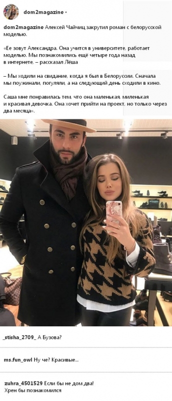 22 ноября 2017 года Алексей Чайчиц сообщил фанатам о своей новой возлюбленной, ради этой девушки молодой человек принял решение об отказе от ухаживаний за телеведущей Ольгой Бузовой. Всем известно о том, что Алексей сопровождал Ольгу на концерт, состоявшийся в Минске. Не является тайной и тот факт, что Чайчиц вышел на сцену к начинающей певице с огромнейшим букетом шикарных цветов. Вместо того чтобы организовать кастинг и выбрать таким образом действительно подходящую ему девушку, парень совершенно неожиданно завел речь о том, что он неравнодушен именно к Бузовой. Однако, если исходить из последних сведений, Алексей абсолютно не терял времени напрасно и именно в Минске он без особых усилий сумел найти замену Ольге. Теперь избранницей Чайчица стала некая Александра, белорусская модель. Эти двое знакомы уже на протяжении четырех лет, однако лишь сейчас приняли решение пообщаться более тесно и лучше узнать друг друга. При этом Саша не возражает и против того чтобы прийти к молодому человеку на телестройку, хотя ей удастся это сделать не ранее чем по прошествии двух месяцев. Сегодня о возможной участнице реалити-шоу общественности известно весьма немного. Девушка является студенткой университета, а работа в модельном бизнесе служит для нее источником заработка. К тому же Алексей дал Александре определение «миленькой и маленькой». Впечатление от снимка и мнение о том, действительно ли Саша сможет стать постоянной подругой Алексея Чайчица на достаточно длительный период времени, вы можете изложить в комментариях.