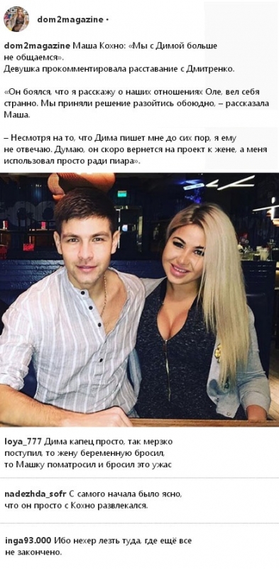 22 ноября 2017 года Мария Кохно сочла возможным сообщить окружающим, по какой причине прервались ее взаимоотношения с Дмитрием Дмитренко. Фанатам довелось совсем недолго порадоваться за Дмитрия, который после крайне неуравновешенной и истеричной Ольги Рапунцель сблизился с Кохно. Однако после нескольких недель этого романа и исполненных положительных эмоций фотографий в социальных сетях Дмитренко внезапно удалил все совместные с Машей снимки, усердно уверяя поклонников в том, что с этой девушкой его никогда и не связывало ничего, кроме обыкновенной дружбы. Однако при этом сама Мария до последнего момента полагала, что они с Дмитрием являются счастливой парой и объясняла удаление их фотографий жестким распоряжением со стороны пиар-директора молодого мужчины. Лишь теперь, когда начались разговоры о намерении Дмитренко непременно воссоединиться с супругой, Кохно все же решилась открыть всю правду, касающуюся их разрыва. Как утверждает Маша, она и Дмитрий пришли к выводу, что в дальнейшем им не следует встречаться. Правда, этот факт нисколько не мешает Дмитренко по-прежнему регулярно звонить этой девушке, что порядком ей мешает, но Мария вовсе не собирается прощать мужчину, который использовал ее исключительно в целях собственного пиара. Свое мнение о том, сожалеете ли вы о расставании Дмитрия Дмитренко и Марии Кохно, вы можете высказать в комментариях.