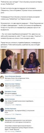 Многих весьма удивило известие о том, что Ольга все же попала на Первый канал. К тому же совсем недавно Константин Эрнст дал слово зрителям основного федерального канала не иметь никакого отношения к ведущей телепрограммы, обладающей весьма скандальной популярностью. Исходя из кадров первого эфира, Бузова с первых же шагов зарекомендовала себя отнюдь не самым лучшим образом и теперь однозначно едва ли вернется на телешоу «Бабий бунт», которое ей предстояло вести совместно с Софико Шеварнадзе, Юлией Барановской и иными знаменитостями. Ольгу вывел из себя тот факт, что со-ведущие то и дело перебивали ее, не давая молодой женщине вставить ни единого слова. Правда, сначала Бузова все же старалась держаться в рамках приличия, но в итоге ее терпение иссякло.