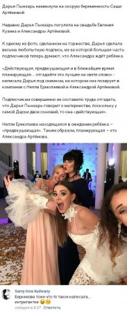 28 ноября 2017 года Дарья Пынзарь решилась намекнуть окружающим на то, что Александра Артемова, только что вступившая в официальный брак со своим избранником Евгением Кузиным, уже готовится стать матерью.