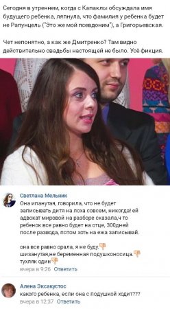 Но почти никто не мог прежде предположить, что Ольга станет лгать не только относительно ожидания ребенка, но и насчет своего брака. По окончании одного из последних эфиров, когда молодая женщина объявила всем, что ее дочь будет зарегистрирована под фамилией Григорьевская, всем стало понятно, по какому поводу Рапунцель точно так же лгала. Во всяком случае, теперь приверженцы телепрограммы нисколько не сомневаются в том, что на протяжении всего этого времени она без зазрения совести обманывала подписчиков, а ее бракосочетание с Дмитрием Дмитренко являлось лишь обыкновенным розыгрышем и спектаклем, в противном случае Ольге пришлось бы в соответствии с законом дать девочке фамилию отца.