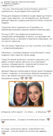 15 декабря 2017 года бывший муж телеведущей Ольги Бузовой Дмитрий Тарасов внезапно изменил свои намерения и отказался от помолвки с Анастасией Костенко.