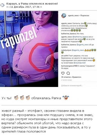 Немало сплетен вызвал и стоп-кадр одного из последних эфиров. Наблюдательные поклонники обратили внимание на то, что в определенную минуту живот просто отошел от тела «будущей мамы». Если бы не свитер и стремление Рапунцель удержать его рукой, накладка могла бы отвалиться полностью.