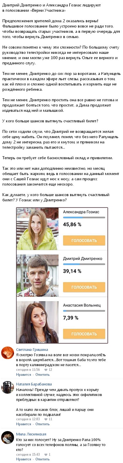 Почти никто не сомневается в том, что это голосование придумано исключительно ради воссоединения семьи Дмитрия Дмитренко и Ольги Рапунцель. К тому же Рапунцель буквально в каждом эфире с горечью говорит о том, насколько тяжела участь одинокой матери, и уже нисколько не отрицает того, что она продолжает любить супруга.