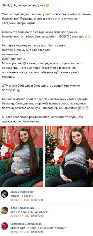 19 декабря 2017 года Ольга Рапунцель была вынуждена поспешно удалить размещенный ею пост, поскольку молодая женщина перепутала сроки собственного «интересного положения».