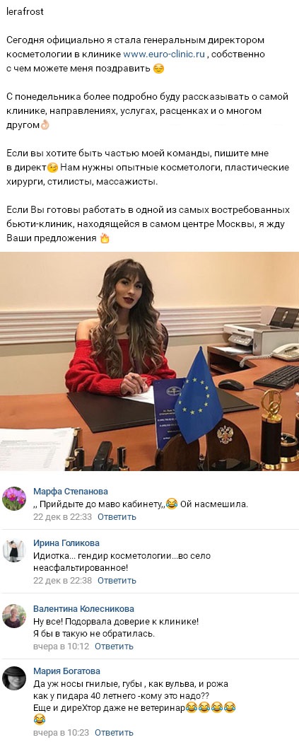 23 декабря 2017 года Валерия Фрост с гордостью сообщила поклонникам о том, что ей удалось найти новое, причем довольно престижное и неплохо оплачиваемое место работы. Почти никто не сомневался в том, что после ухода с телепроекта Лера, как и многие ее экс-коллеги по телестройке, решит открыть небольшой салон красоты либо шоу-рум. Некоторые и вовсе считали, что, потеряв бесплатное проживание и питание на телепрограмме, Фрост не станет задерживаться в столице, а поторопится вернуться к себе на родину в Киев. Но в реальности ситуация сложилась совершенно иначе. Смотрите также: дом 2 дневной за 25 декабря 2017 Валерия охотно рассказала подписчикам о своих достижениях, сообщив им о том, что она была назначена на должность генерального директора косметологии в одном из медицинских учреждений. Она также пообещала, что уже в ближайшие дни подробно расскажет фанатам о том, чем занимается эта клиника и какие обязанности станет выполнять там она сама. К тому же Лера немедленно предложила работу высококлассным массажистам, опытным специалистам в области пластической хирургии и стилистам. Поклонники Фрост тут же поторопились ее поздравить, однако недоброжелатели немедленно воспользовались ее словами ради очередных насмешек. Они полагают, что работа Валерии является всего лишь пиар-ходом медицинской организации, причем не особенно удачным. Впечатление от снимка и мнение о том, верите ли вы, что у Валерии Фрост наконец начинает складываться карьера, вы можете изложить в комментариях.