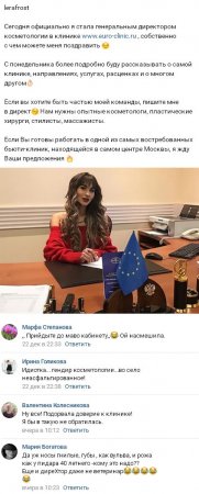 Валерия охотно рассказала подписчикам о своих достижениях, сообщив им о том, что она была назначена на должность генерального директора косметологии в одном из медицинских учреждений. Она также пообещала, что уже в ближайшие дни подробно расскажет фанатам о том, чем занимается эта клиника и какие обязанности станет выполнять там она сама. К тому же Лера немедленно предложила работу высококлассным массажистам, опытным специалистам в области пластической хирургии и стилистам.
