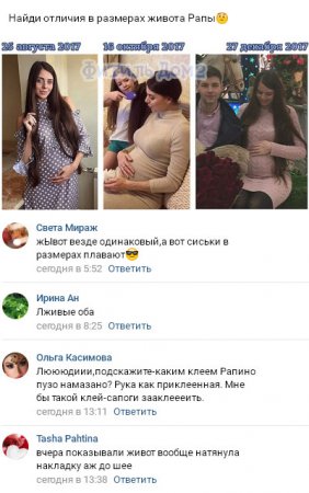 «Интересное положение» этой молодой женщины по-прежнему вызывает искренний интерес у поклонников телепроекта. Правда, ранее многие полагали, что для имеющегося срока беременности, который сама Рапунцель по каким-то причинам не в силах верно назвать, живот является чрезмерно большим, то теперь у фанатов телешоу возникают другие вопросы. В Интернете размещен коллаж из фотографий Ольги. Глядя на эти фотоснимки нетрудно сделать вывод о том, что за последние четыре месяца живот Рапунцель абсолютно не изменился и не увеличился в размерах.