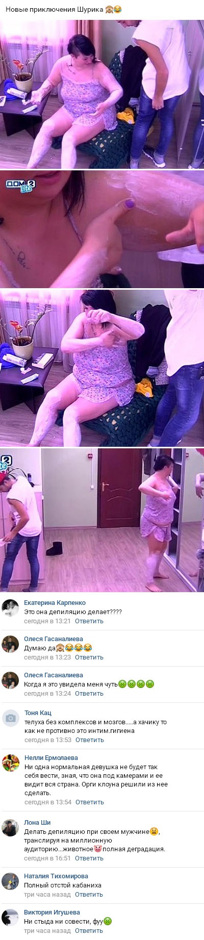 5 марта 2018 года поклонникам реалити-шоу оказалось просто не под силу спокойно выдержать кадры нового эфира, на которых перед зрителями снова предстала Александра Черно. Весьма упитанная девушка постоянно оказывается объектом язвительных насмешек и резких критических замечаний. Но сама Александра абсолютно не стесняется собственной внешности. Во всяком случае, в ходе проектных эфиров она нередко показывается лишь в нижнем белье либо завернувшись в одеяло. К тому же Саша даже не дает себе труда хотя бы умыться или минимально привести в порядок волосы. Смотрите также: дом 2 вечерний эфир 08.03.2018 Однако подобный вид Черно у многих вызывает настоящее физическое отвращение. Совсем недавно фанаты телестройки оказались свидетелями попыток молодой женщины осуществить депиляцию рук, ног и подмышек. Со стороны это зрелище оказалось крайне непривлекательным, тогда как Александра без всякого смущения демонстрировала огромные телеса всей стране. Нет ничего удивительного в том, что девушке снова были предъявлены претензии в явном нежелании снизить вес. Большинство приверженцев телепроекта не понимают, по какой причине Черно не стремится пользоваться возможностями, предоставляемыми ей организаторами, и не старается все же привести себя в сколько-нибудь приемлемое состояние. Впечатление от снимка и мнение о том, действительно ли Александре Черно необходимо вплотную заняться ее внешним видом, вы можете высказать в комментариях.
