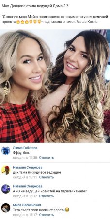 16 марта 2018 года выяснилось, что Майя Донцова наконец сумела достичь давно желаемой цели и теперь находится на одном уровне с телеведущими Ольгой Бузовой и Ксенией Бородиной. На протяжении последнего времени девушка не перестает говорить о предстоящем бракосочетании с Алексеем Купиным. В то же время еще совсем недавно Майя не желала даже слышать о замужестве и материнстве, резко обрывая все разговоры бойфренда на данную тему и подчеркивая, что пока для нее первоочередное значение имеет развитие карьеры. Смотрите также: дом 2 за 19.03.18 дневной Но уже нет сомнений в том, что Донцова так и не смогла уговорить Купина отложить хотя бы ненадолго визит в ЗАГС и, главное, рождение наследников. Однако в плане работы на телевидении Майе все же повезло. Во всяком случае, Мария Кохно утверждает, что Донцовой удалось оказаться на посту телеведущей, причем непосредственно на реалити-шоу. Кохно поторопилась от души поздравить приятельницу с помощью социальных сетей и не стала скрывать, что искренне гордится подругой, сумевшей подняться столь высоко. Свое мнение о том, заслуживает ли Майя Донцова должности проектной ведущей, вы можете высказать в комментариях.