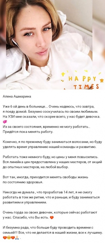 18 марта 2018 года Алена Ашмарина проинформировала подписчиков о том, каким будет пол ожидаемого ею младенца.