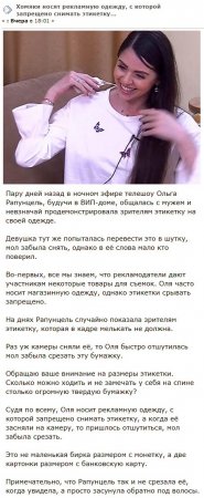 Но оказалось, что отнюдь не все вещи навсегда предоставляются в распоряжение персонажей телепередачи. Совсем недавно в весьма неловкое и неудобное положение попала Рапунцель. В кадре засветилась этикетка, прикрепленная к новой блузке Ольги. Правда, сама молодая женщина постаралась перевести в шутку, но фактически никто из телезрителей не поверил ее словам.