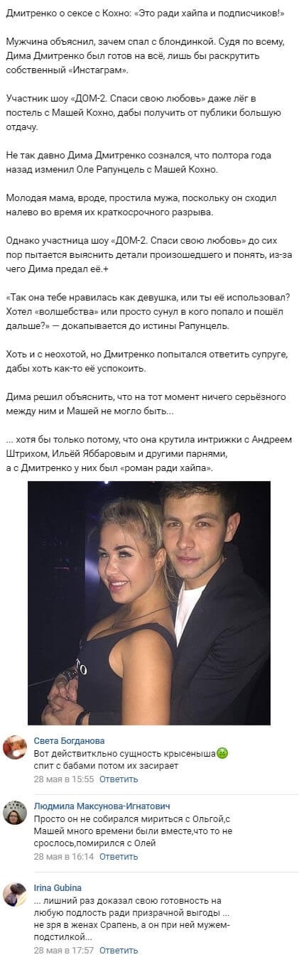 Дима, сохранявший молчание по данному поводу на протяжении полутора лет, неделю назад внезапно решился признаться в том, что он действительно допустил неверность жене. Отныне Дмитрий вознамерился не скрывать более факта волшебства с Марией Кохно. Стоит учитывать то обстоятельство, что прежде Дмитренко старался уверить всех в том, что он размещал в виртуальном пространстве снимки с этой девушкой только для этого, чтобы разозлить свою жену Олю, тогда как в реальности между Димой и Машей не имелось никаких физических контактов.
