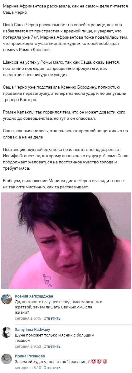 25 июня 2019 года фолловеры убедились в том, что участница телестройки Александра Черно, которая в прошлом уже обманывала проектную телеведущую Ксению Бородину, теперь точно так же вводит в заблуждение и Романа Капаклы. Ни для кого не является секретом тот факт, что известная «перезагрузка», организованная для Саши Бородиной, так и не привела ни к каким ощутимым результатам. Хотя прежде Ксюше и удалось помочь измениться к лучшему множеству российских представительниц прекрасного пола, с Черно Ксения потерпела полнейшую неудачу. Более того, сейчас аналогичный провал случился и у Капаклы, полностью уверенного в собственном мастерстве в качестве тренера. Сама Александра уверяет подписчиков, что придерживается диеты, женщина подчеркивает, что постепенно избавляется от излишних килограммов, но ее коллега по периметру Марина Африкантова не стала скрывать от поклонников телепроекта реальной ситуации. В частности, Саша была вынуждена отказаться от безбелкового варианта диеты и переключиться на более привычные для большинства людей методы похудения, включающие в себя полный отказ от чрезмерно калорийных и вредных для здоровья продуктов питания. Однако на самом деле Черно продолжает в немалых количествах поглощать «вкусняшки», доставляемые ей супругом Иосифом Оганесяном. К тому же Александра то и дело жалуется на острое чувство голода, настаивая на том, чтобы ей давали как можно больше еды.