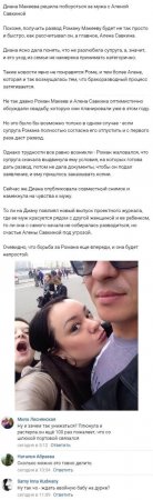 26 сентября 2019 года выяснилось, что Диана Макеева, пока остающаяся в статусе официальной жены Романа Макеева, бойфренда Алены Савкиной, намеревается все же вернуть изменившего ей супруга.