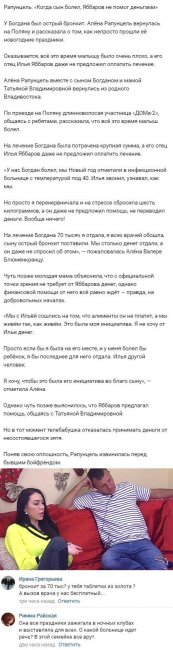 Как утверждает молодая мама, Яббаров в данной ситуации проявил полнейшую безучастность к происходящему. Алена проинформировала фолловеров о том, что Илья всего лишь пару раз позвонил ей в связи с болезнью мальчика и даже не сделал каких-либо попыток перевести Савкиной деньги, требующиеся для восстановления здоровья Богдана. При этом сама женщина заплатила за врачебные осмотры и назначенные лекарства приблизительно 70 тысяч рублей.