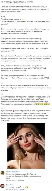 Фанаты Рапунцель беспощадно раскритиковали Розу из-за тех нападок, которые супруга Шабарина позволила себе в отношении Ольги. Розалии пообещали весьма скорый распад ее брака, а также изгнание с громким скандалом не только с телевизионной передачи, но и из самой России. К тому же многие из поклонников матери маленькой Василисы Дмитренко подвергли чрезвычайно язвительным насмешкам лицо Райсон, тщательно обработанное с помощью Фотошопа. Пользователи социальных сетей подчеркнули, что Роза лишь пытается ввести в заблуждение окружающих относительно ее возраста, но в действительности она наверняка давно перешагнула 30-летний рубеж. Более того, из-за не слишком привлекательного внешнего облика жену Андрея Шабарина даже сравнили с таким негативным персонажем русских народных сказок, как Баба Яга. После данных нелестных высказываний по поводу ее персоны Розалия никак не могла не пожалеть о том, что ранее она настолько некрасиво и непорядочно поступала с Ольгой Рапунцель.