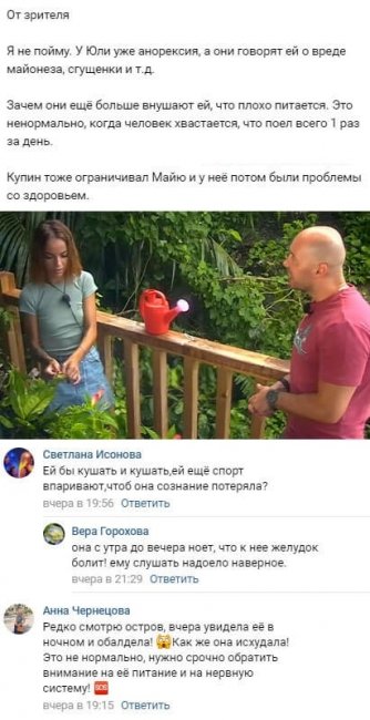 26 января 2020 года любители телевизионной программы поспешили стать на защиту участницы реалити-шоу Юлии Щегловой, над которой позволяют себе откровенно издеваться проектные телеведущие. В то время как сама Юля не перестает жаловаться на неважное самочувствие, причем девушка действительно фактически ежедневно теряет массу тела, ведущие телестройки и возлюбленный Щегловой Игорь Русанов постоянно ставят перед нею новые и чрезвычайно нелегкие задачи. В частности, окружающие настаивают на том, чтобы Юлия регулярно выполняла многочисленные физические упражнения и при этом исключила из своего рациона питания абсолютно все продукты, которые могут оказаться вредными для ее здоровья. Выяснилось, что Игорь приходит в искреннюю ярость, если его подруга поглощает майонез или что-либо из той категории, которую сам Русанов характеризует в качестве «пищевого мусора». Поклонники телепередачи просто не понимают, по какой причине именно Щегловой уделяется столь серьезное внимание в сфере режима питания. Для фолловеров является совершенно очевидным тот факт, что Юля, явно страдающая определенными комплексами и буквально преследуемая насмешками со стороны других людей, и без всяких диет ощутимо худеет. Более того, телезрителей беспокоит возможность наличия у Щегловой столь серьезной проблемы, как анорексия. При этом многие из телезрителей вспомнили, что ранее аналогичным образом поступал и Алексей Купин, жестко заставляя свою избранницу Майю Донцову сбрасывать вес. Фанаты реалити-шоу не забыли и о том, что в результате таких действий со стороны Алексея у Майи возникли значительные сложности в плане здоровья женской репродуктивной системы.