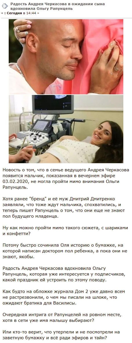 4 февраля 2020 года выяснилось, что участница телепроекта Ольга Рапунцель без колебаний решила пойти на явный обман ради того, чтобы полностью скопировать поступок супруги телеведущего Андрея Черкасова Кристины. В то время как все вокруг горячо поздравляют чету Черкасовых с тем, что в их семействе на свет первым появится мальчик, Оля Рапунцель занята подготовкой настоящего сюрприза как для фолловеров, так и для своего избранника Дмитрия Дмитренко. Если ранее мама маленькой Василисы настаивала на том, что она ожидает сынишку, то теперь Ольга постоянно твердит о том, что пока и для нее самой остается тайной пол вынашиваемого ребенка. Как утверждает жена Дмитренко, такой информацией располагает исключительно врач-гинеколог, наблюдающий за развитием ее беременности. Правда, доктор якобы указал пол малыша на той бумажке, которую он передал Дмитрию и Ольге. По словам самой Рапунцель, она собирается организовать торжественное празднество, где и сделает соответствующее объявление. Большинство подписчиков абсолютно уверены в том, что Оля отнюдь не случайно пожелала воспользоваться идеей Кристины Черкасовой, чтобы лишний раз оказаться в проектном эфире и привлечь к себе внимание телезрителей. При этом молодую мать, судя по всему, нисколько не беспокоит то, что ее в очередной раз изобличили в несомненной лжи. Давая интервью изданию, посвященному телестройке, что происходило еще в декабре, Ольга уже проинформировала всех о том, что ее малышка нетерпеливо дожидается рождения брата.