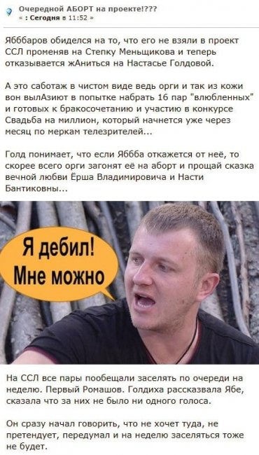 Невзирая на то, что Яббаров не афиширует свое недовольство, мужчина явно испытывает искреннюю обиду на организаторов телепроекта. Именно этим была обусловлена его ссора с Настей Голд и весьма печальное лицо в ходе очередного лобного места. К тому же неизвестно, сохранит ли Илья и далее отношения с Анастасией, которая, если верить свежим слухам, уже ожидает от него младенца. Очевидно, без программы «Спаси свою любовь» у Яббарова не имеется желания продолжать общение с Настей, отличающейся непредсказуемым и вспыльчивым нравом.