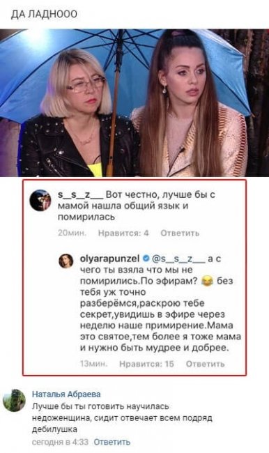 Накануне фанаты телевизионной передачи порекомендовали Рапунцель обязательно найти взаимопонимание с родительницей, причем в самой суровой и нелицеприятной форме. Но, судя по всему, подобные рекомендации уже оказались неактуальными для Ольги. Молодая женщина чрезвычайно резко заставила замолчать всех, кто позволял себе высказываться на данную тему.
