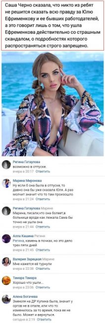 К тому же не только Юлия категорически не желает комментировать все, что имеет отношение к ее неожиданному увольнению. Герои телепередачи также не намереваются ни подтверждать, ни опровергать соответствующие слухи. В частности, будущая мама Александра Черно порекомендовала своим фолловерам обращаться с подобными вопросами исключительно к самой Ефременковой и прекратить беспокоить Сашу по такому поводу.