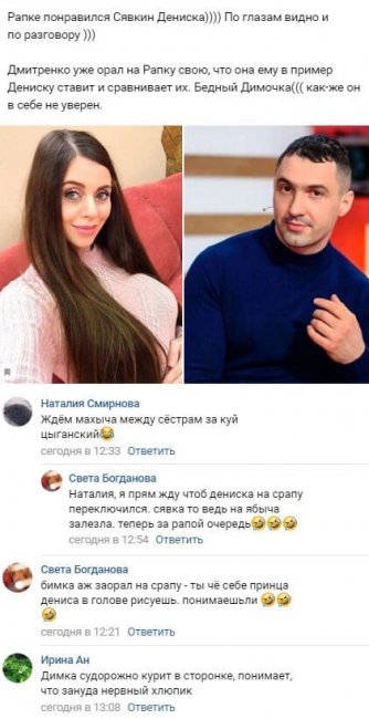 1 марта 2020 года обитатель периметра Дмитрий Дмитренко не смог спокойно отнестись к тому, что его жена Ольга Рапунцель однозначно симпатизирует бойфренду своей младшей сестры Алены Савкиной. В то время как мама маленького Богдана от души радуется вновь завязавшимся отношениям с Денисом Мокроусовым, в семье Оли и Димы в очередной раз начались значительные недоразумения. Видимо, Рапунцель сумела увидеть некие качества безупречного мужчины, однако не в своем собственном муже, а в приятеле родственницы. Дмитрий устроил громкий скандал из-за того, что супруга позволила себе сравнить его с Денисом, к тому же соответствующее сравнение оказалось вовсе не в пользу Дмитренко. Дима жестко подчеркнул, что он отнюдь не заслужил столь пренебрежительного отношения к себе со стороны Ольги, поскольку именно он буквально круглосуточно заботится о маленькой Василисе и при этом регулярно готовит еду для всего семейства. К тому же и некоторые из фанатов телевизионного шоу уже полностью уверены в том, что Оля на самом деле весьма расположена к Мокроусову. Они уже не раз замечали, что у Рапунцель действительно горят глаза, едва разговор начинает касаться Дениса. Судя по всему, теперешний друг Алены нравится Ольге существенно больше, чем ее официальный спутник жизни.