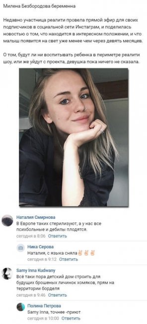 Фолловеры также искренне порадовались за будущую мать. Однако в то же время многие из них явно тревожатся в связи с тем, что весьма нестабильная и неустойчивая психика Милены, а также предрасположенность Алексея к садизму могут негативным образом отразиться на их отпрыске. Более того, неизвестно, решится ли Безус все же зарегистрировать брак с приятельницей, поскольку прежде юноша категорически не желал посещения ЗАГСа.
