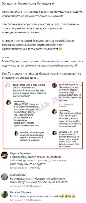Однако совершенно очевидно, что жена Дмитрия Дмитренко напрасно упомянула подобную проблему, в очередной раз заставив окружающих сомневаться в наличии у нее «интересного положения». Пользователи социальных сетей стараются угадать, чем может завершиться для Рапунцель длительный перелет. При этом некоторые из подписчиков беспокоятся о том, что Ольга вполне способна в результате потерять ребенка, а недоброжелатели ехидно пытаются разоблачить ее ложь. Как полагают хейтеры, в действительности абсолютно все, в том числе и руководство реалити-шоу, отлично знают, что молодая мама обманывает относительно беременности. Соответственно, женщина, выдающая за отпрыска обыкновенную подушку, на самом деле ничем не рискует.
