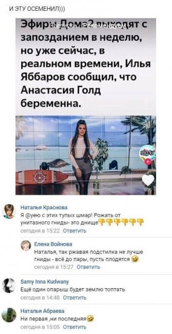 Но, скорее всего, Илье в связи с последними обстоятельствами придется поспешить с реализацией его намерений, что, прежде всего, касается регистрации брака. Уже на протяжении нескольких дней в виртуальном пространстве не прекращаются оживленные разговоры о том, что Настя находится в «интересном положении». Более того, из-за недавней тошноты в утренние часы, которую явно испытывала Голд, едва ли не все фанаты реалити-шоу уже фактически уверены в ее беременности.