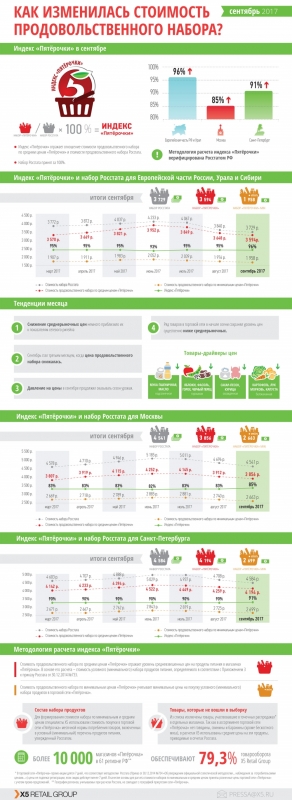 В этой торговой сети рассчитывают свой индекс цен, фиксирующий соотношение средней стоимости продуктового набора в стране и в её магазинах. Методология его определения верифицирована Росстатом. Так индекс «Пятёрочки» в сентябре показал, что стоимость продовольственной корзины по средневзвешенным ценам в магазинах сети европейской части России, Урала и Сибири была на 4% ниже показателя Росстата: 3 594 руб. В московских «Пятёрочках» продовольственный набор стоил 3 856 руб. — на 15% меньше его стоимости в столице по Росстату. В Санкт-Петербурге разница составила 9%, а стоимость корзины — 4 194 руб.