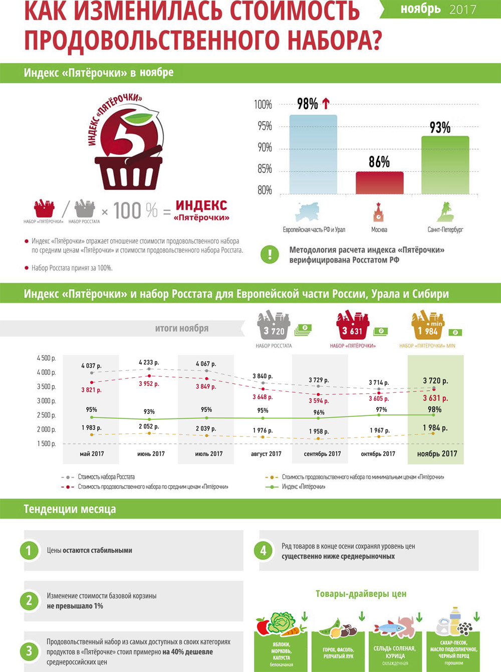 Как подсчитал Росстат, набор из 33 продуктов в среднем по России стоил 3 720 рублей, в Москве — 4 553 рубля, в Санкт-Петербурге — 4 517 рублей.Расчёты X5 Retail Group, на основании которых она регулярно определяет индекс «Пятёрочки» (отражает отношение стоимости продовольственной корзины по средним ценам сети и стоимости продовольственного набора Росстата), соответствуют официальным российским: цена аналогичной продуктовой корзины в «Пятёрочке» в ноябре тоже оставалась стабильной. В магазинах сети европейской части России, Урала и Сибири минимальный продуктовый набор стоил в среднем 3 631 рубль, в Москве — 3 907 рублей, в Санкт-Петербурге — 4 209 рублей. Таким образом, российский индекс «Пятёрочки» составил 98%. В Москве его значение определено на уровне 86%, в Санкт-Петербурге — 93% по отношению к корзине Росстата в этих городах. Российское статистическое ведомство сообщает, что наиболее заметный рост цен в ноябре продемонстрировала плодоовощная продукция, а также яйца, молоко, рыба. Однако в универсамах торговой сети цены на эти товары практически не изменились по сравнению с октябрём. А потому яйца там стоили на 7% дешевле, чем в среднем по стране, молоко — на 10%. Цены на картофель, капусту, морковь также оставались стабильными и были, соответственно, на 32%, 7% и 17% ниже, чем подсчитал Росстат. Кроме этого, в универсамах сети на 6% подешевели замороженные и охлаждённые куры, на 7% — репчатый лук, на 5% — пшено. А продовольственный набор из самых доступных в своих категориях продуктов стоил на 40% меньше, чем в среднем по стране. На европейской территории России, Урале и в Сибири — 1 984 рубля, в Москве — 2 680 рублей, в Санкт-Петербурге — 2 711 рублей.