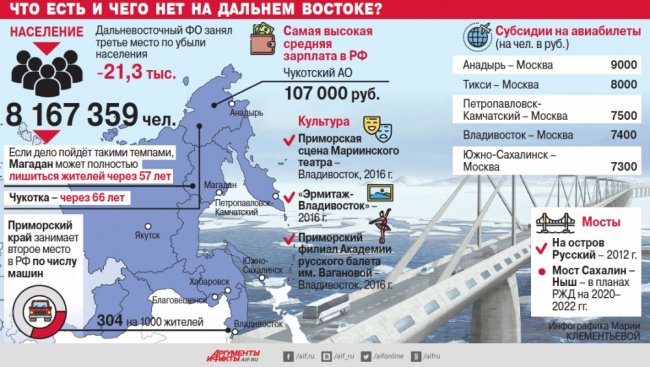 — Природные богатства и выгоднейшее географическое положение Дальнего Востока не используются даже на десятую долю. По валовому внутреннему продукту он в 10 раз уступает даже небольшой Южной Корее. Про Китай и Японию говорить не приходится. Да, есть надежда: в последнее время темпы развития дальневосточной экономики увеличивались, даже когда в целом по России прирост ВВП падал. Строительство экспортных трубопроводов, космодрома, новых заводов, льготы для иностранных инвесторов — всё это даёт результат. В 2013–2017 гг. региональный продукт ежегодно прирастал до 2,7%. Однако в Китае в это же время годовой прирост не опускался ниже 6,9%. И в этом огромный риск. Отставание от соседних стран и уменьшение населения Дальнего Востока через 2–3 поколения может привести к тому, что Россия его фактически потеряет. Что поставит крест на её глобальных экономических и геополитических амбициях.