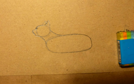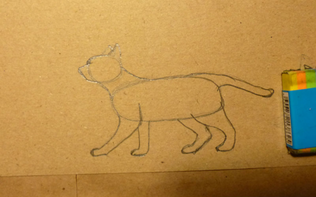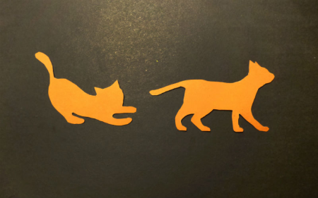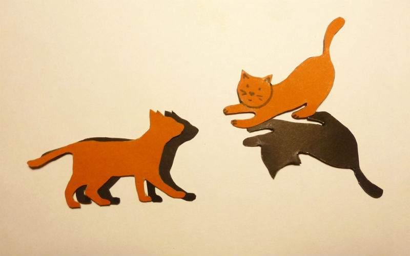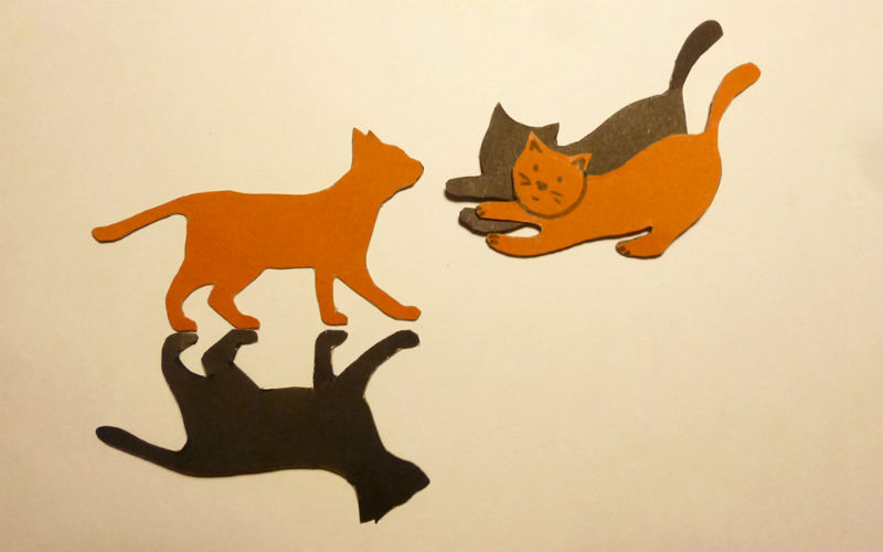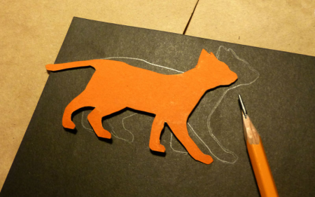 Теперь обводим силуэт котика на чёрной бумаге и вырезаем. Это будет тень.