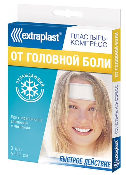 Охлаждающий гелевый пластырь-компресс EXTRAPLAST «От головной боли». Старый знакомый холодный компресс в современной версии. При использовании охлаждающего гелевого пластыря-компресса EXTRAPLAST от головной боли нет необходимости неподвижно лежать в одном положении и придерживать полотенце или ледяной пузырь. Пластырь «Экстрапласт» от головной боли клеится на лоб или заднюю поверхность шеи и остается там, пока вы его не снимете сами, что позволяет продолжать двигаться и делать любые обычные дела. Вдобавок пластырь не нужно постоянно менять или охлаждать, чтобы продлить действие, как в случае с обычным дедовским компрессом. За счет ментола, который входит в состав пластыря, охлаждающий эффект сохраняется до шести часов.