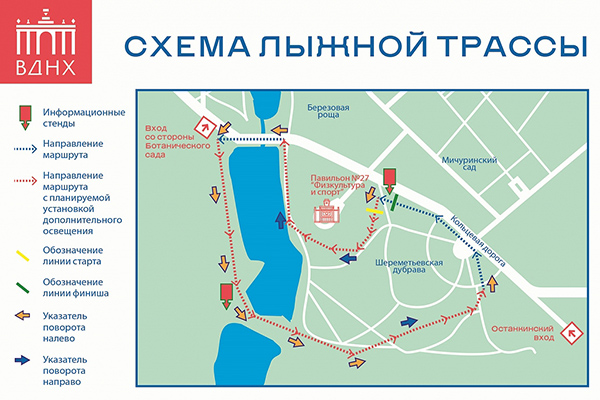Предпочитаете кататься на лыжах? Добро пожаловать на лыжную трассу! Она открывается на территории главной выставки страны 15 января. Общая длина трассы составит 1,5 км. Стартовая точка расположена у павильона №27 «Физкультура и спорт». По лыжне можно кататься на своих лыжах как в одиночку, так и целой семьей, с друзьями. Лыжная трасса проходит по самым живописным местам запрудной зоны ВДНХ. Вот ее подробная схема.
