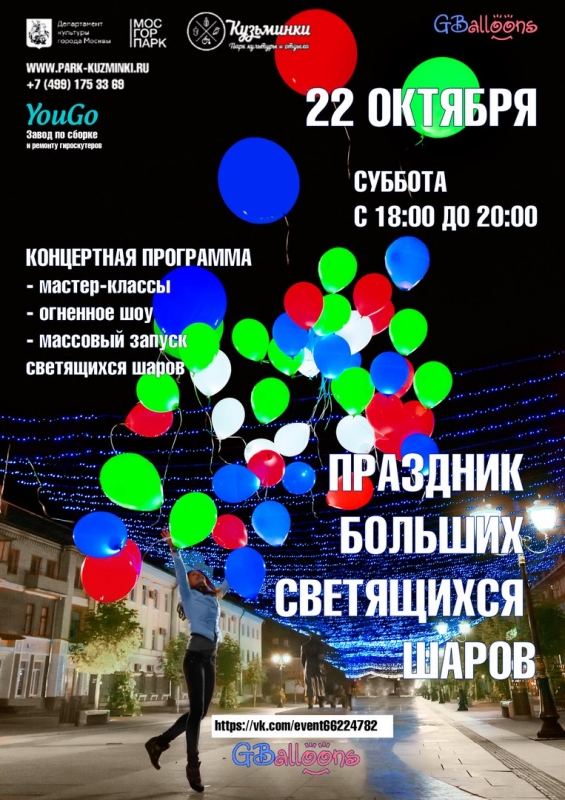 В «Кузьминках» в субботу устроят массовый запуск светящихся воздушных шаров и отпразднует это событие песнями (выступают участники детского и взрослого шоу «Голос»), танцами, а также огненным и световым представлениями. Детей можно смело брать с собой – во-первых, нет в мире ребенка, равнодушного к воздушным шарам, а загадать желание на празднике и отправить его в небо сможет любой желающий, во-вторых, для юных зрителей устроят шоу трансформеров – талантами будут блистать светящиеся бронированные Бамблби и Метатрон.