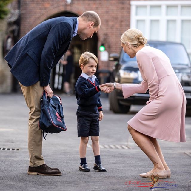 Малыша Джорджа проводил в школу папа - мама, страдающая токсикозом в третьей беременности, не смогла этого сделать. У ворот школы первоклассника встретила директор младшей школы Хелен Хаслем и они вместе с принцем Уильямом отвели Джорджа в класс.На официальной странице в инстаграме королевская семья выложила фотографии и видео этого волнительного события. Малыш Джордж взволнован, да и папа Уильям нервничает, хотя не подает вида.