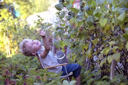 Малыш пытается оторвать ягоду от черенка, но не рассчитывает силу и — бац! — спелая смородина брызжет соком, оставив в Фединой ладони сдувшийся шарик вместо ягоды .